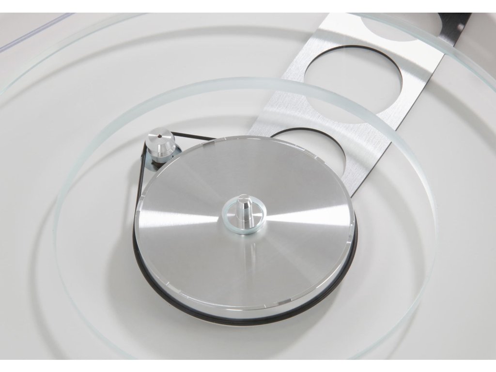 Dvouvrstvý skleněný talíř s leštěným okrajem je usazen na hliníkovém unašeči s přesným mosazným ložiskem. Tento systém zajišťuje plynulé otáčení a minimalizuje tření. Výsledkem je čistý zvuk bez zkreslení, který vynikne při každé desce.