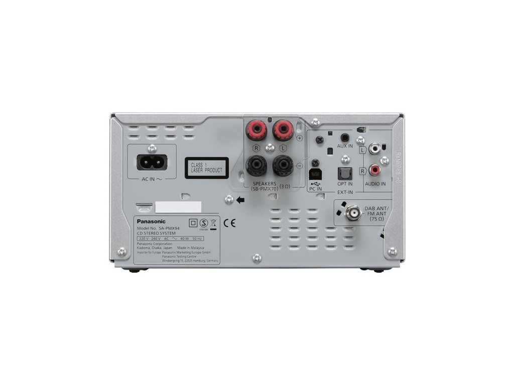 Panasonic SC-PMX94EG stříbrný je kvalitní stereofonní mikrosystém s velmi ceněnými třípásmovými reprosoustavami, CD mechanikou, FM a DAB+ rozhlasovým přijímačem, USB portem a možností přijímat Bluetooth signál z telefonů, tabletů, počítačů a dalších podobných zařízení. Nabízí vzhledem ke své ceně velmi kvalitní zvuk a komfort ovládání. Vyrábí se ve dvou barevných provedení, černém a stříbrném. Reprosoustavy jsou u obou barevných variant stejné- černé. Systém je velmi slušně zpracovaný, čelní panel je kovový, ovládací jsou prvky logicky a účelně rozmístěné. Středová mechanika je rychlá a kultivovaná. Reprosoustavy jsou třípásmové s basreflexem dozadu. Mřížka z akustické tkaniny je snadno odnímatelná. Systém disponuje bezdrátovým přenosem Bluetooth (z venku dovnitř), dále optickým digitálním vstupem například pro připojení televizoru a analogovým, stereofonním CINCH vstupem pro připojení například gramofonu.