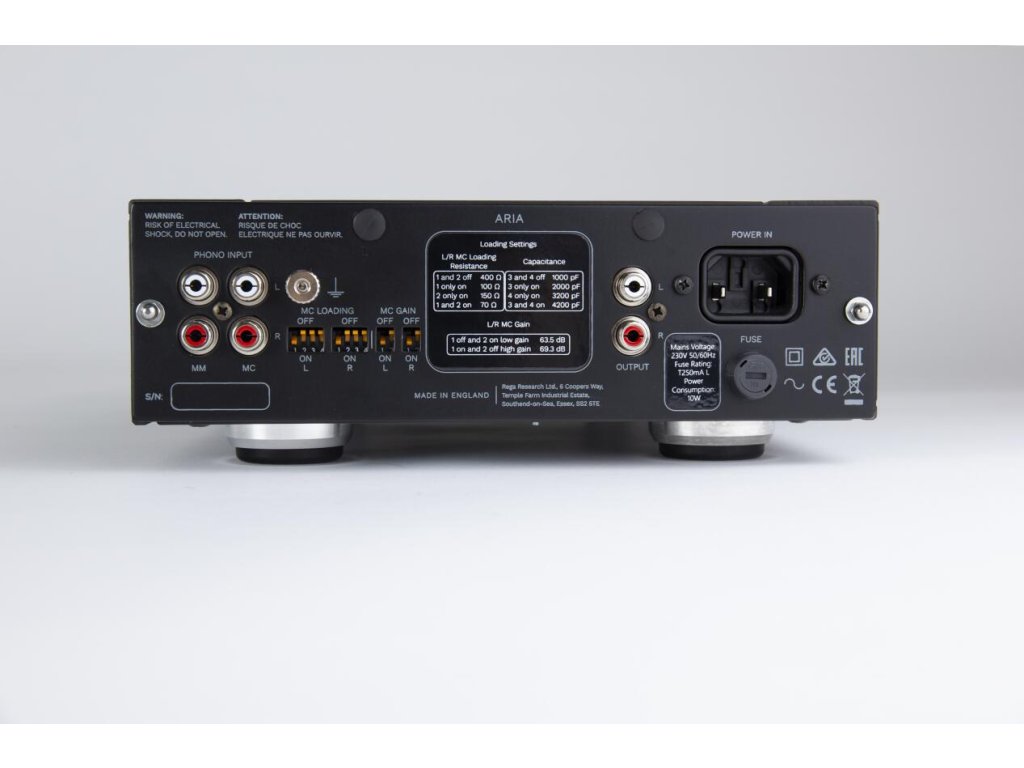 Rega Aria je plně analogový předzesilovač pro MM a MC přenosky bez jakýchkoli digitálních obvodů. Celohliníková skříň stínu vnitřní obvody proti pronikání vnějšího rušení. Aria disponuje množstvím inovativních konstrukčních prvků, jako je např. samozoraditelné servo ovládání, které udržuje obvody MC vstupu v optimálním nastavení kompenzací rozdílu mezi provozní teplotou a teplotou prostředí. Obě sekce mají oddělené vstupní konektory a vstupní obvody. To umožnilo navrhnout vstupní obvody na míru bez jakýchkoli kompromisů pro oba typy přenosek. Přepínání signálu je zajištěno ve vysoké úrovni a nízké impedanci pomocí relé a signál je tedy bez degradace.