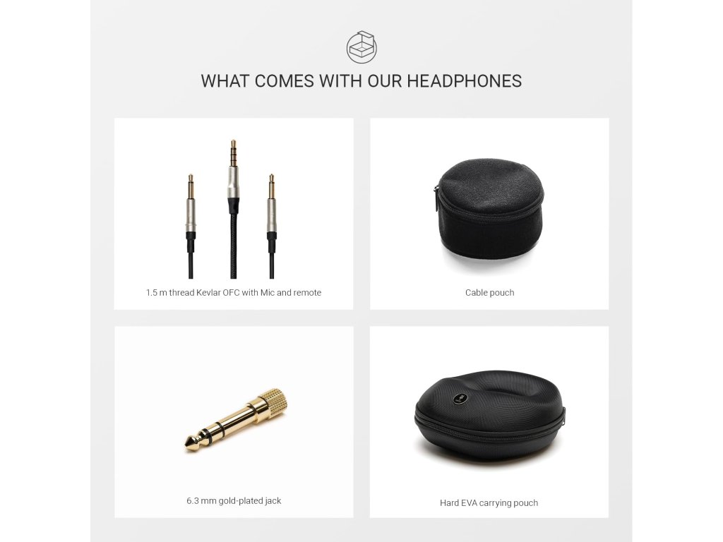 Balení obsahuje cestovní pouzdro, dva kabely a adaptér 6,3 mm.