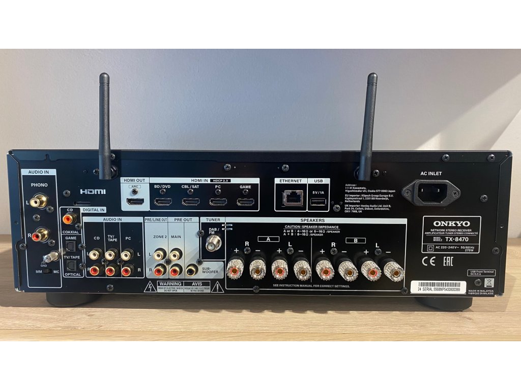 Vstupy: Phono MM/MC, 3× RCA, 2× optický, 1× koaxiální, 4× HDMI 2.1 (8K/60Hz, 4K/120Hz), USB, Wi-Fi, Bluetooth