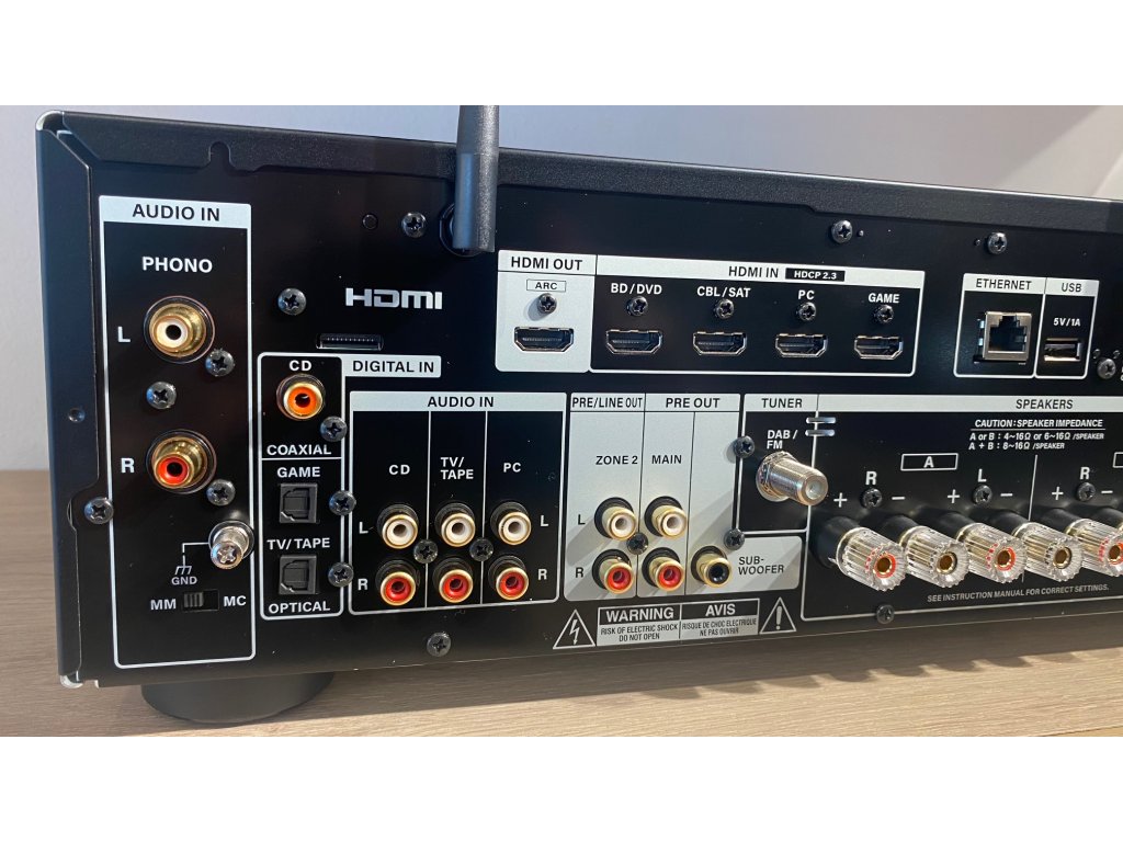 Vstupy: Phono MM/MC, 3× RCA (CD, TV/Tape, PC), 2× optický, 1× koaxiální, 4× HDMI 2.1 (8K/60Hz, 4K/120Hz), USB, Wi-Fi, Bluetooth 5.0
