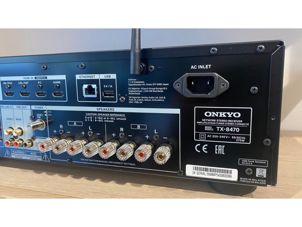 TX-8470 nabízí široké možnosti připojení: 3 RCA vstupy, phono MM/MC, 2 optické, 1 koaxiální a 4 HDMI 2.1 vstupy. Zlacené A/B terminály podporují 4–16 Ω reproduktory, což umožňuje připojení dvou párů repro. Ovládání je možné přes dálkový ovladač, Onkyo Controller app nebo hlasové asistenty (Google Assistant, Siri). Crutchfield.com (web:5) vyzdvihuje „snadnou integraci do smart domácností“.