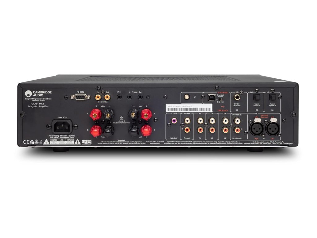 Čtyři RCA vstupy, XLR pro profesionální zdroje a digitální vstupy (2× optický, koaxiální, USB-B) pokrývají vše od CD přehrávačů po TV. Výstup na subwoofer nebo předzesilovač umožňuje rozšíření systému. Dvojité výstupy pro repro podporují bi-wiring nebo druhou zónu.