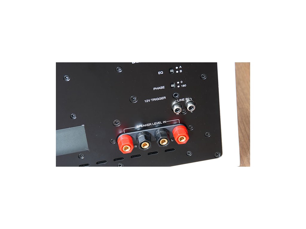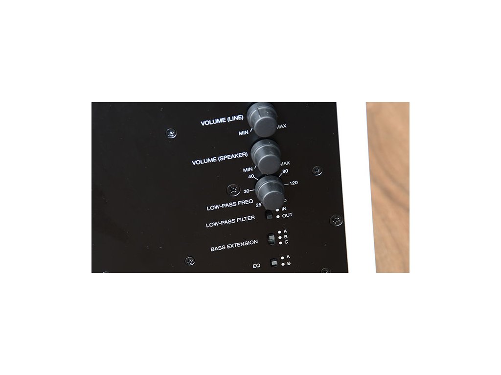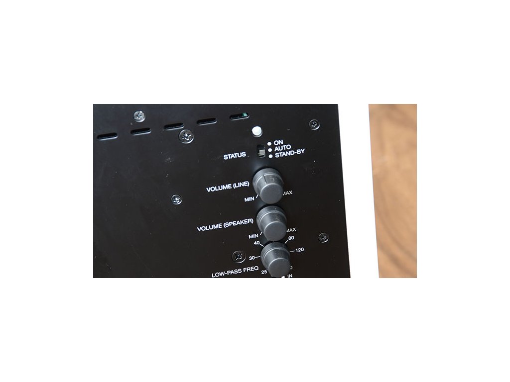 Ovládání: Hlasitost, low-pass filtr (40–140 Hz), fáze (0/180°)
