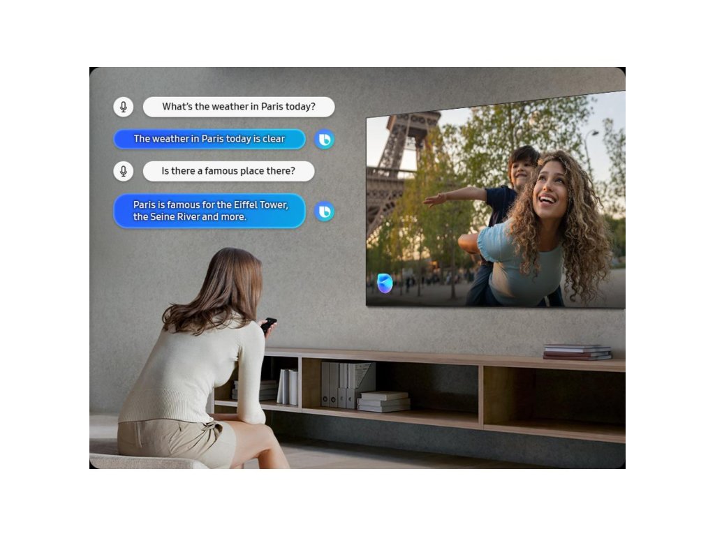 Tizen OS s Bixby, Alexa a Google Assistant umožňuje hlasové ovládání. SmartThings Hub ovládá chytrou domácnost (Matter/Thread). Multi View (až 4 zdroje), AirPlay 2 a Smart View usnadňují sdílení.